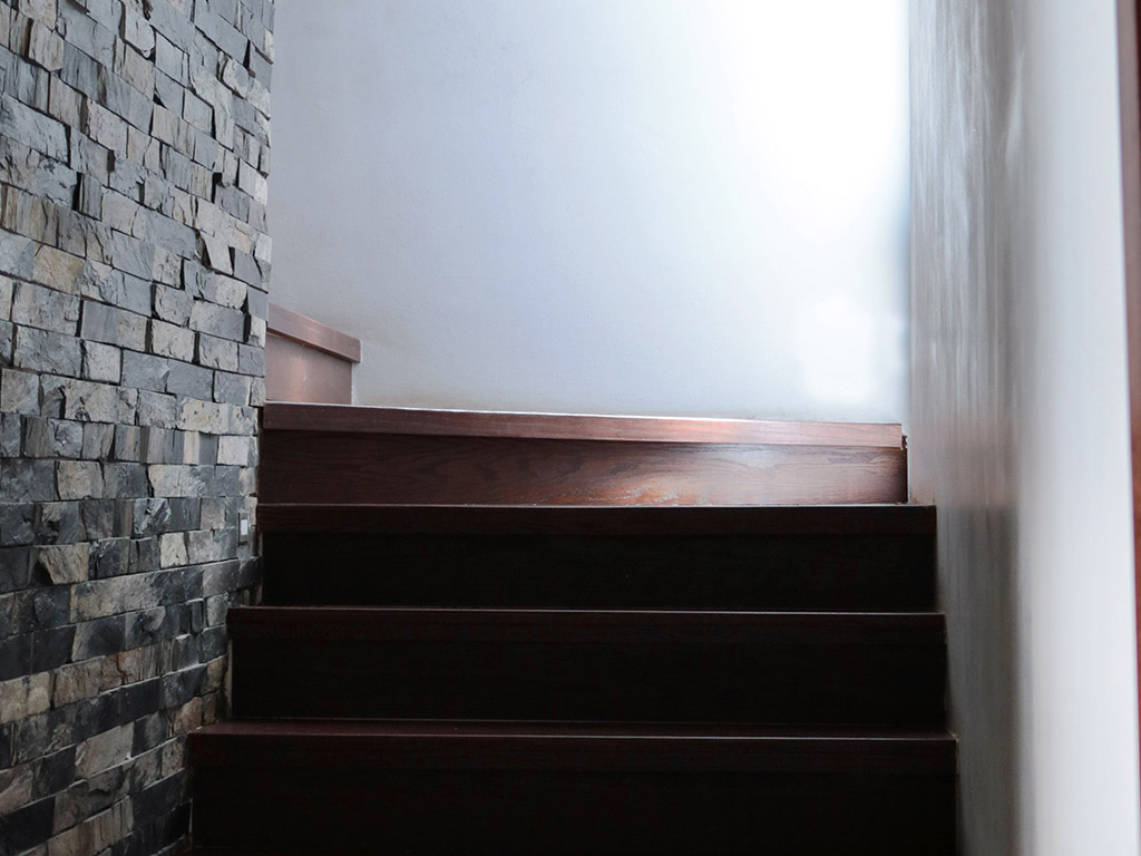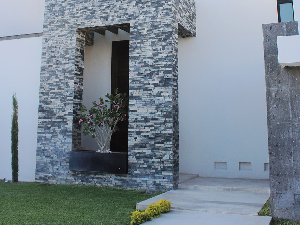 – En su elegante fachada destaca una grapa de doble altura, recubierta de laja negra enmarcando el acceso a la casa.